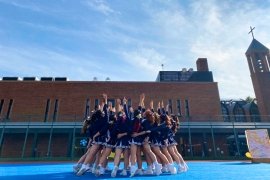 チアリーディング部RECKLESS は月、火、木の週3 回体育館で活動をしています。部員は1、2年生の17 名です。チアという競技を通じて元気・勇気・笑顔をみなさまに届けられるよう日々練習に励んでいます。
