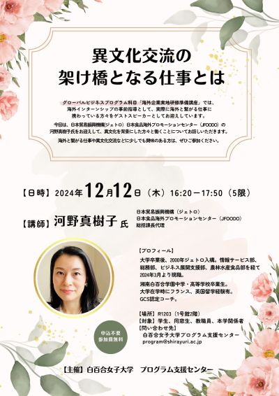 今回は、日本貿易振興機構(ジェトロ)日本食品海外プロモーションセンター(JFOODO)の河野真樹子氏をお迎えして、異文化を背景にした方々と働くことについてお話しいただきます。海外と繋がる仕事や異文化交流などに少しでも興味のある方は、ぜひご参加ください。
