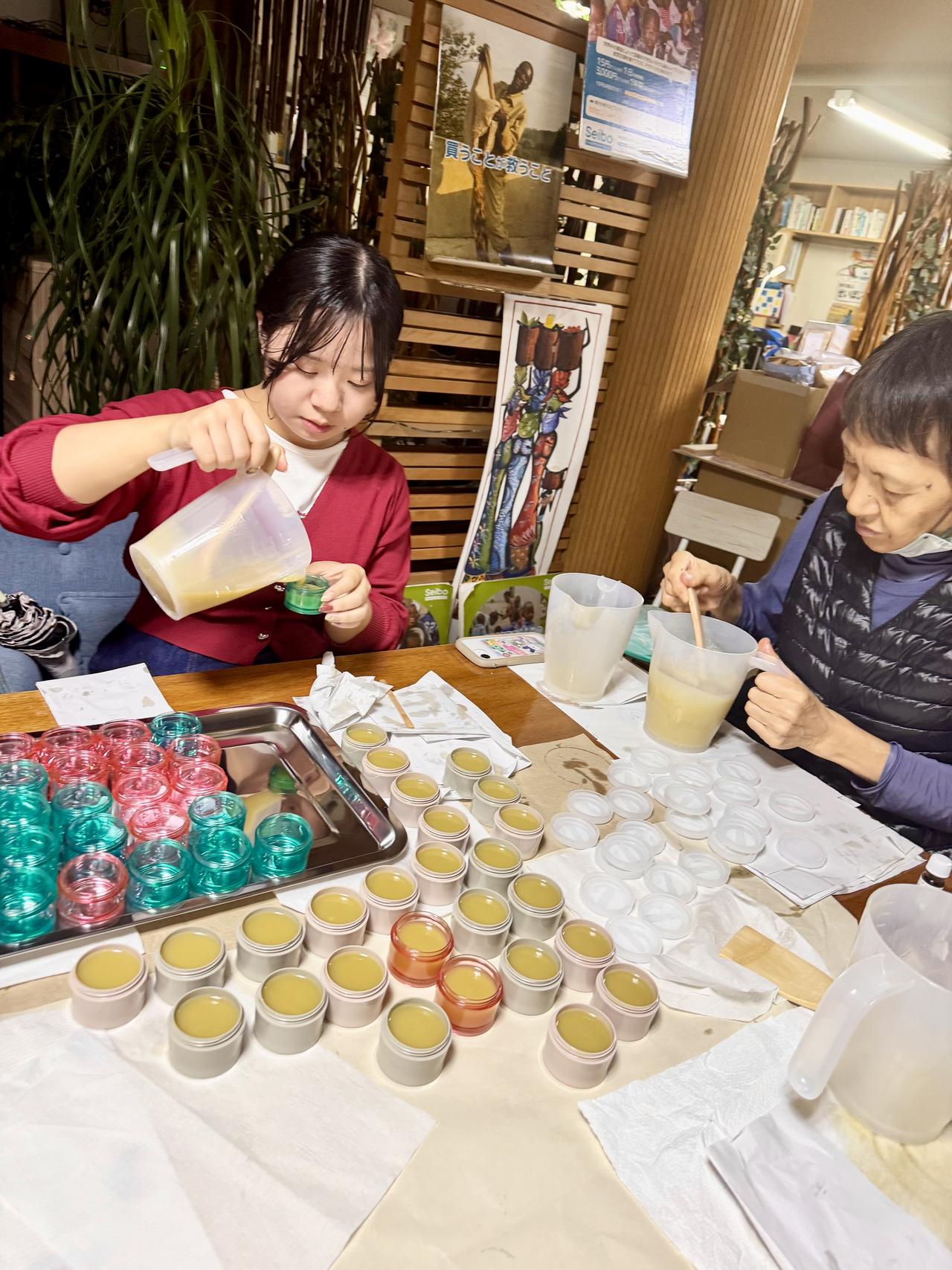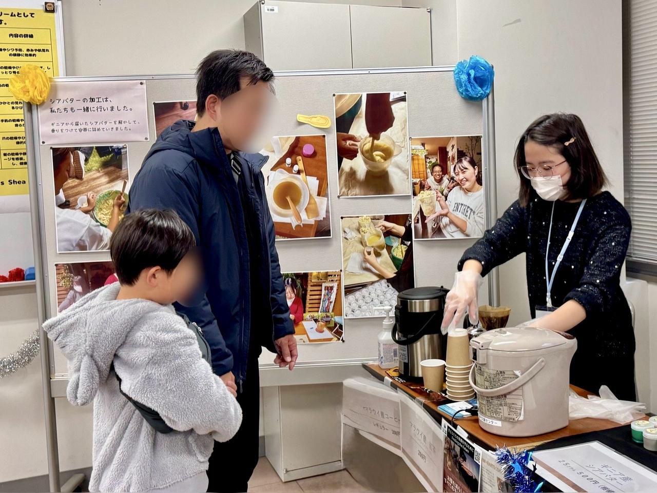今回の取り組みは、NPO法人せいぼのスタッフの一人であるマリアムさん(ギニア人の父を持つ)の協力によって実現。フェアトレードを通して、ギニアの女性たちの自立支援と、マラウイの子どもたちへの給食支援につながります。学生たちは現地の文化や生産背景を学びながら、シアバターの香りの調合や加工、販売計画などを自分たちで考え、白百合祭で商品を販売しました。
