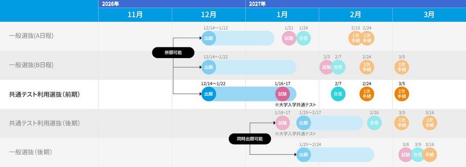 共通テスト利用選抜(前期)は、入学手続を二段階に分けて行うことができます。一次手続期間内までに入学金を納入すれば、二次手続期間期日まで、入学金以外の入学手続時納入金の納入期間を延長できます。なお、一次手続期間内に二次手続を併せて行うことも可能です。
