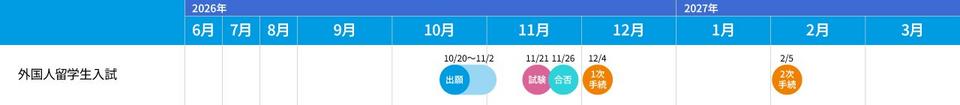 外国人留学生入試は、入学手続を二段階に分けて行うことができます。一次手続期間内までに入学金を納入すれば、二次手続期間期日まで、入学金以外の入学手続時納入金の納入期間を延長できます。なお、一次手続期間内に二次手続を併せて行うことも可能です。