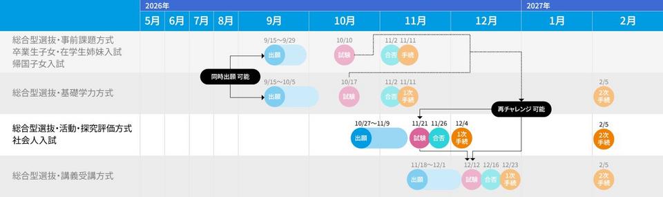 『総合型選抜 活動・探究評価方式』は、入学手続を二段階に分けて行うことができます。一次手続期間内までに入学金を納入すれば、二次手続期間期日まで、入学金以外の入学手続時納入金の納入期間を延長できます。なお、一次手続期間内に二次手続を併せて行うことも可能です。