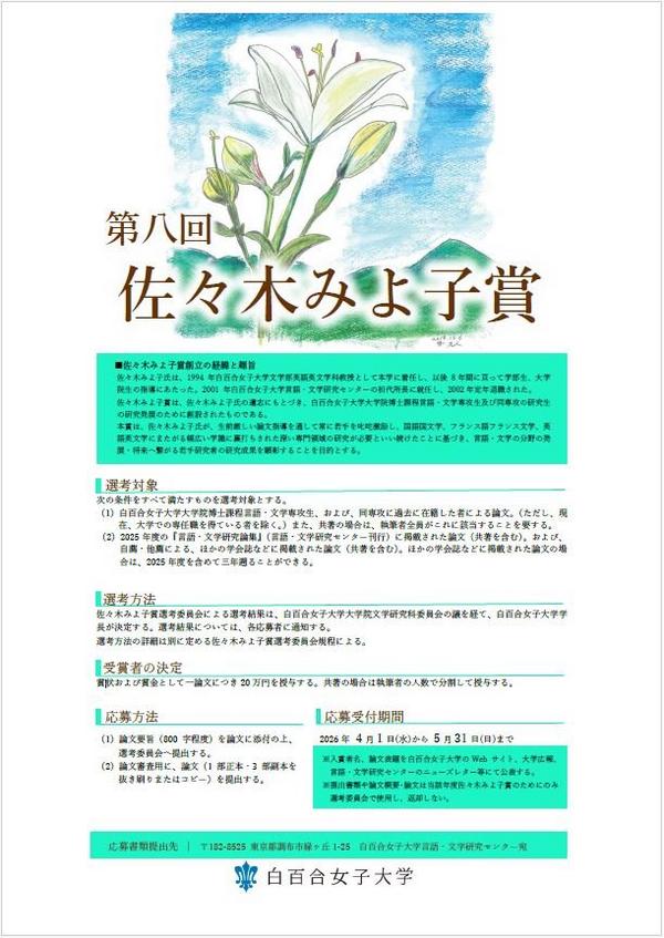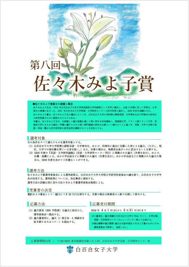 佐々木みよ子先生は、1994年に白百合女子大学文学部英語英文学科教授として着任し、以後8年間に亘って学部生、大学院生の指導にあたられました。2001年には、言語・文学研究センター初代センター長に就任し、2002年に定年退職されました。本賞は、先生の遺志に基づき創設されたものです。