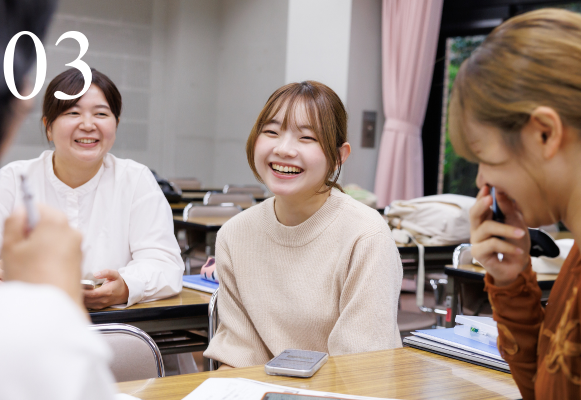 「心理学専門演習(ゼミナール)」では、卒業論文に向けて自分の興味関心のあるテーマを深めていきます。ゼミの仲間との交流も3年次の学びの醍醐味です! 心理的支援の実際を学べる心理演習・心理実習を通して、1・2年次の学びと社会の結びつきも体感できますよ。