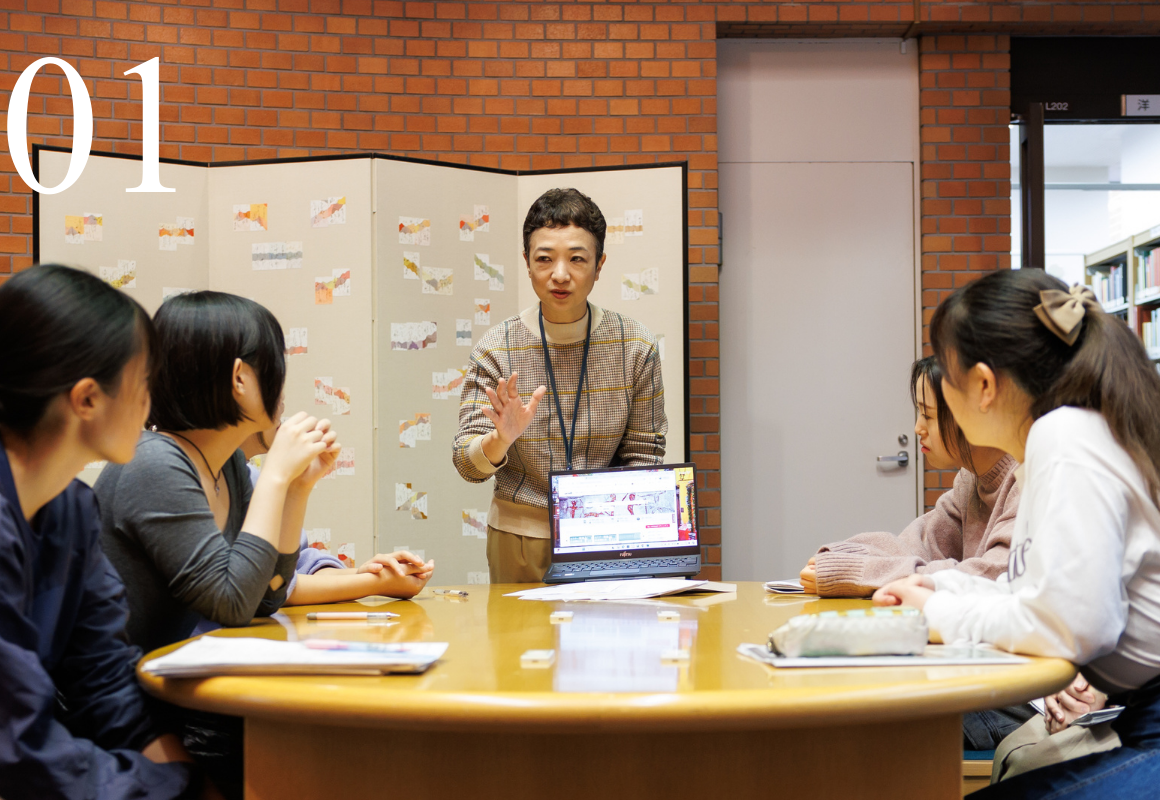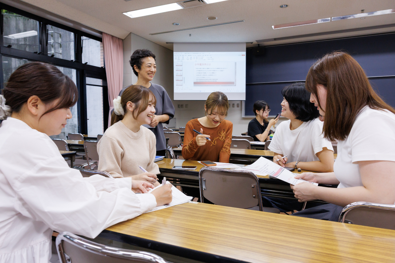 「発達心理学基礎演習」では、発達心理学に関係するテーマについて個人やグループでまとめてプレゼンテーションします。1年次は、4年間の学びの基盤となる発達心理学の基礎を学ぶことで、人の心や人生への理解が深めていきます。