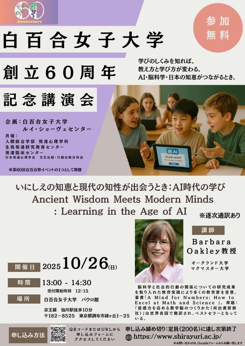 | テーマ | いにしえの知恵と現代の知性が出会うとき:AI時代の学び Ancient Wisdom Meets Modern Minds : Learning in the Age of AI 学びのしくみを知れば、教え方と学び方が変わる。AI・脳科学・日本の知恵がつながるとき。 |