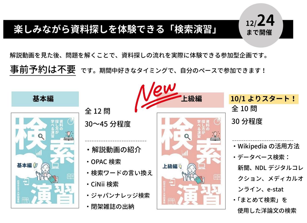 OPACやCiNiiで資料を実際に探す「基本編」に続き、データベースの利用など、より高度な検索を体験する「上級編」がスタートしました。