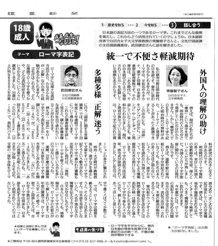 2025年9月18日付読売新聞朝刊「18歳成人 成美、成彦のなるほど!ローマ字表記<3>」において、文学部国語国文学科 常盤智子教授のコメントが掲載されました。
