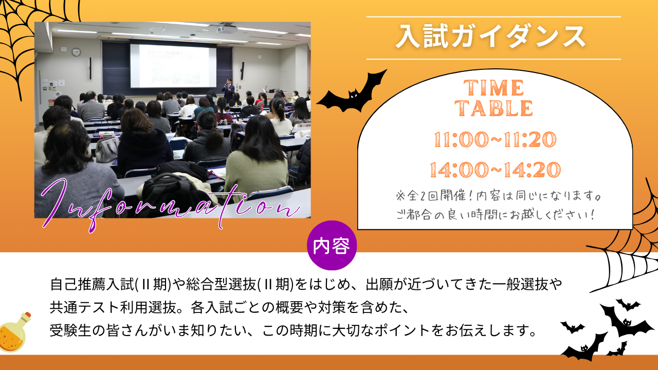 10月26日(日)開催の『入試ガイダンス in 白百合祭』では、自己推薦入試(Ⅱ期)や総合型選抜(Ⅱ期)、一般選抜についてのガイダンスを実施します。