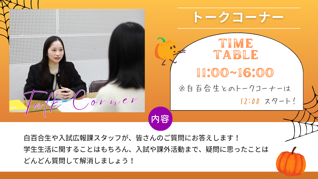 【企 画】入試ガイダンス/学生プレゼン企画「高校生の皆さん お届けモノです!」/白百合生とのトークコーナー/入祖相談コーナー
