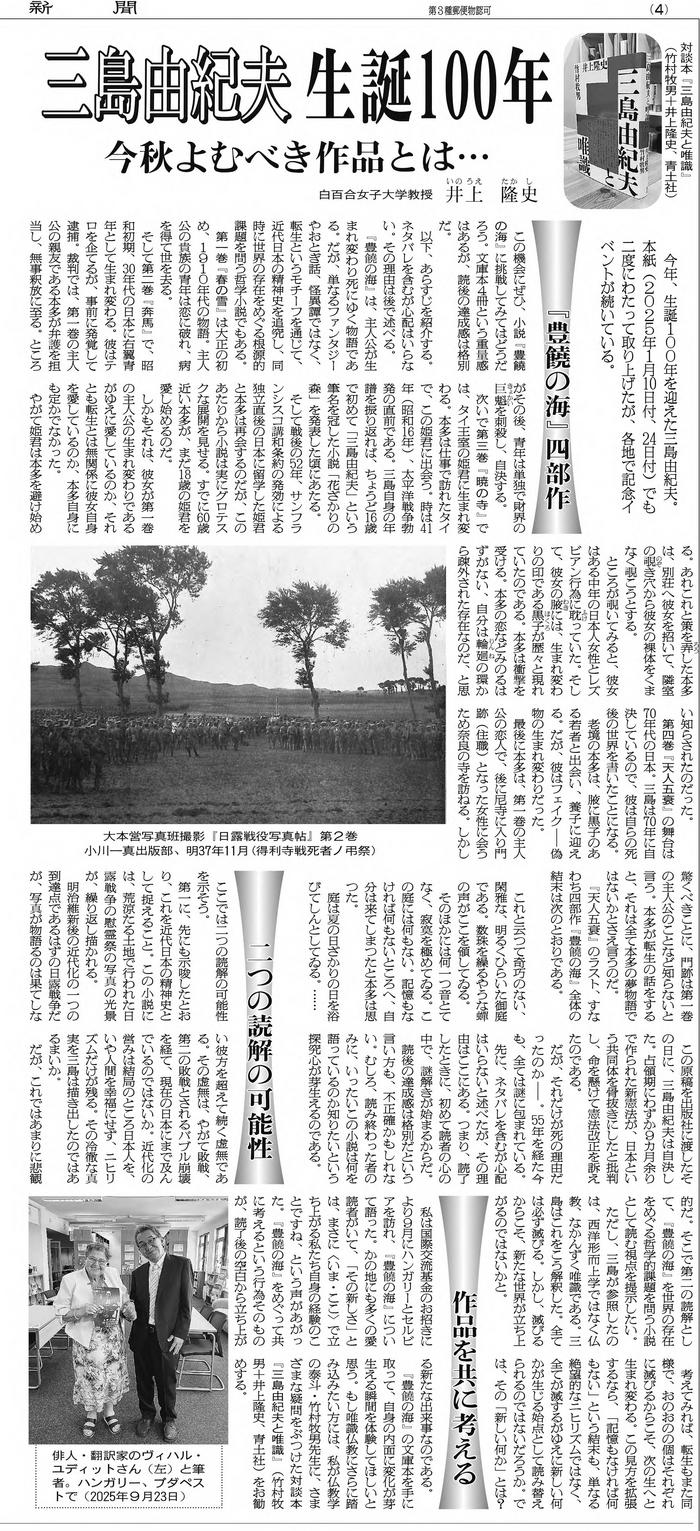 2025年に生誕100年を迎えた三島由紀夫の『豊饒の海』四部作を今秋よむべき作品としてとりあげ、あらすじを紹介したうえで、世界の存在をめぐる哲学的課題を問う小説として読む視点を提示しています。井上教授は、『豊饒の海』を読了したときに、自身の内面に変化が芽生える瞬間を体験してほしいと語っています。ぜひ『豊饒の海』とともにお読みください。