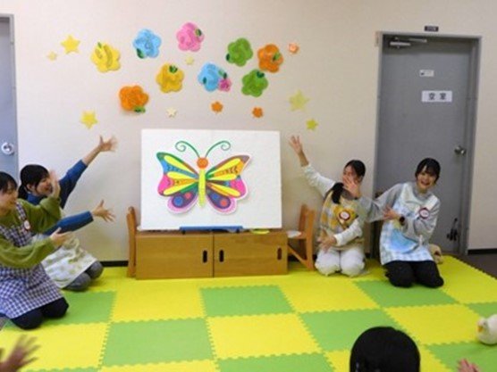 お母さんと一緒に懇談の場に参加するお子さんや、各コーナーを行き来しながら楽しむお子さんもおり、始終和やかな雰囲気で進みました。最後には、親子が一緒になり、学生スタッフによるわらべ歌や手遊び、パネルシアターなどを楽しみました。パネルシアターでは、パネル板にピタッとつくいろいろな食べ物や生き物に興味津々!
