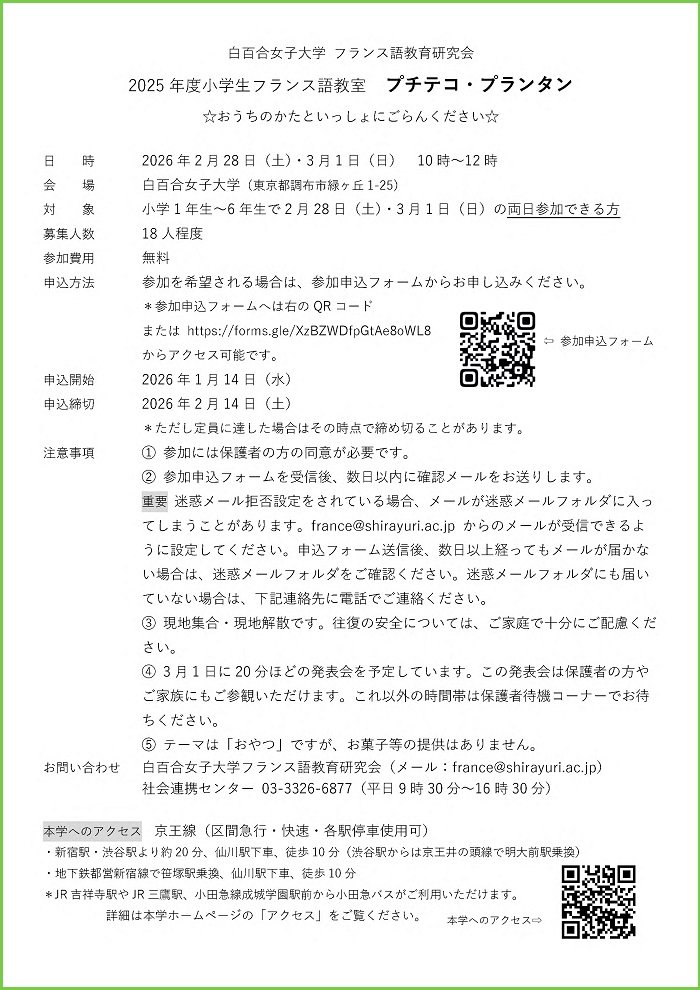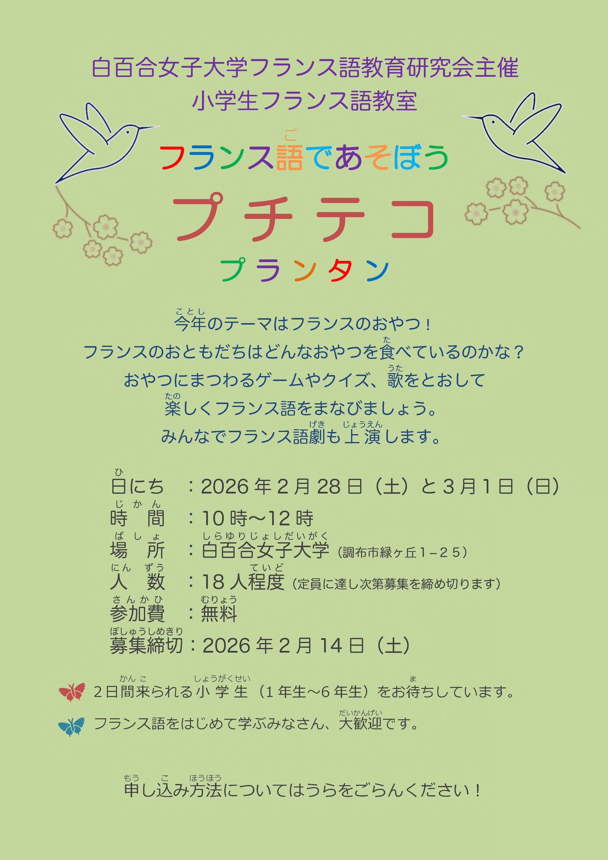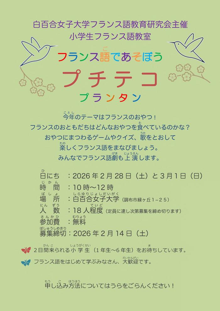 2000年の初開催以来、毎回好評を博している小学生のフランス語教室「プチテコ・プランタン」を、2月28日(土)・3月1日(日)に開催します。今年のテーマはフランスのおやつ! 本学学生やフランス人のスタッフと一緒に、クイズやゲーム、歌や劇をとおして、楽しみながらフランス語を学びましょう。フランス語に初めて触れる方、大歓迎です!