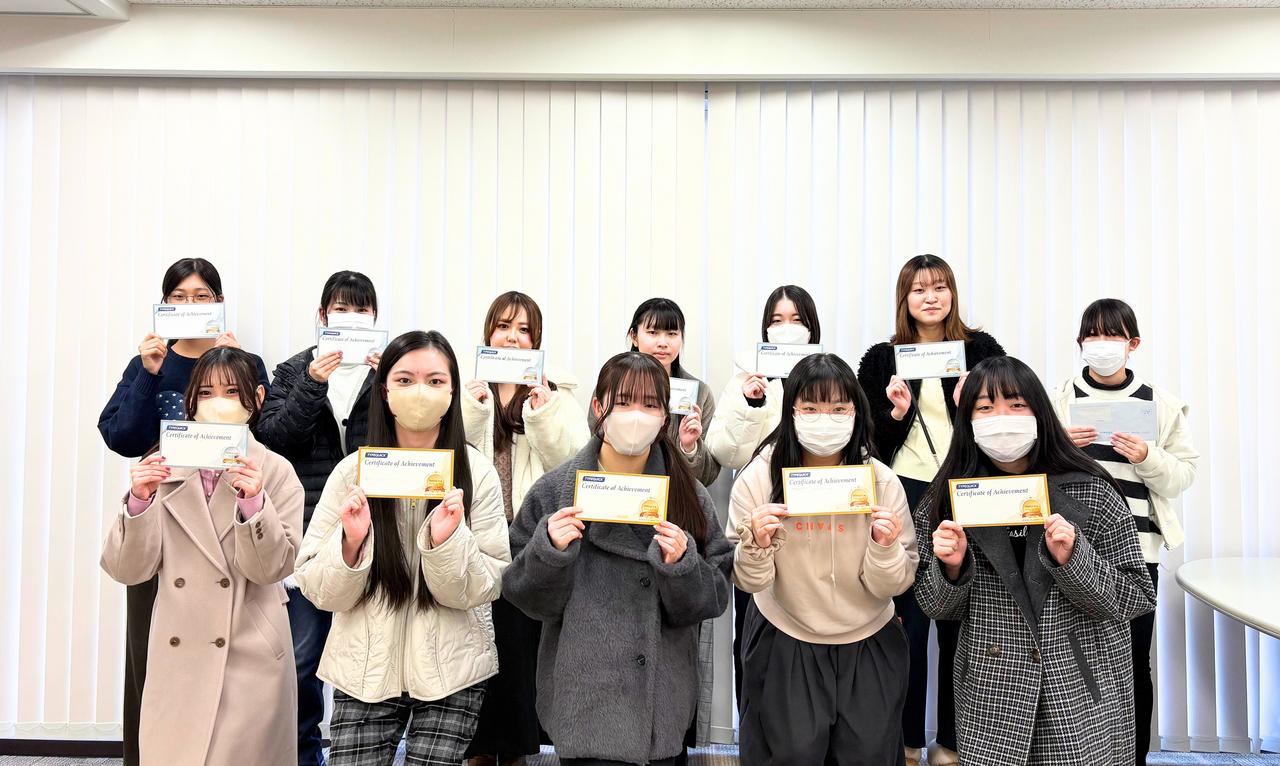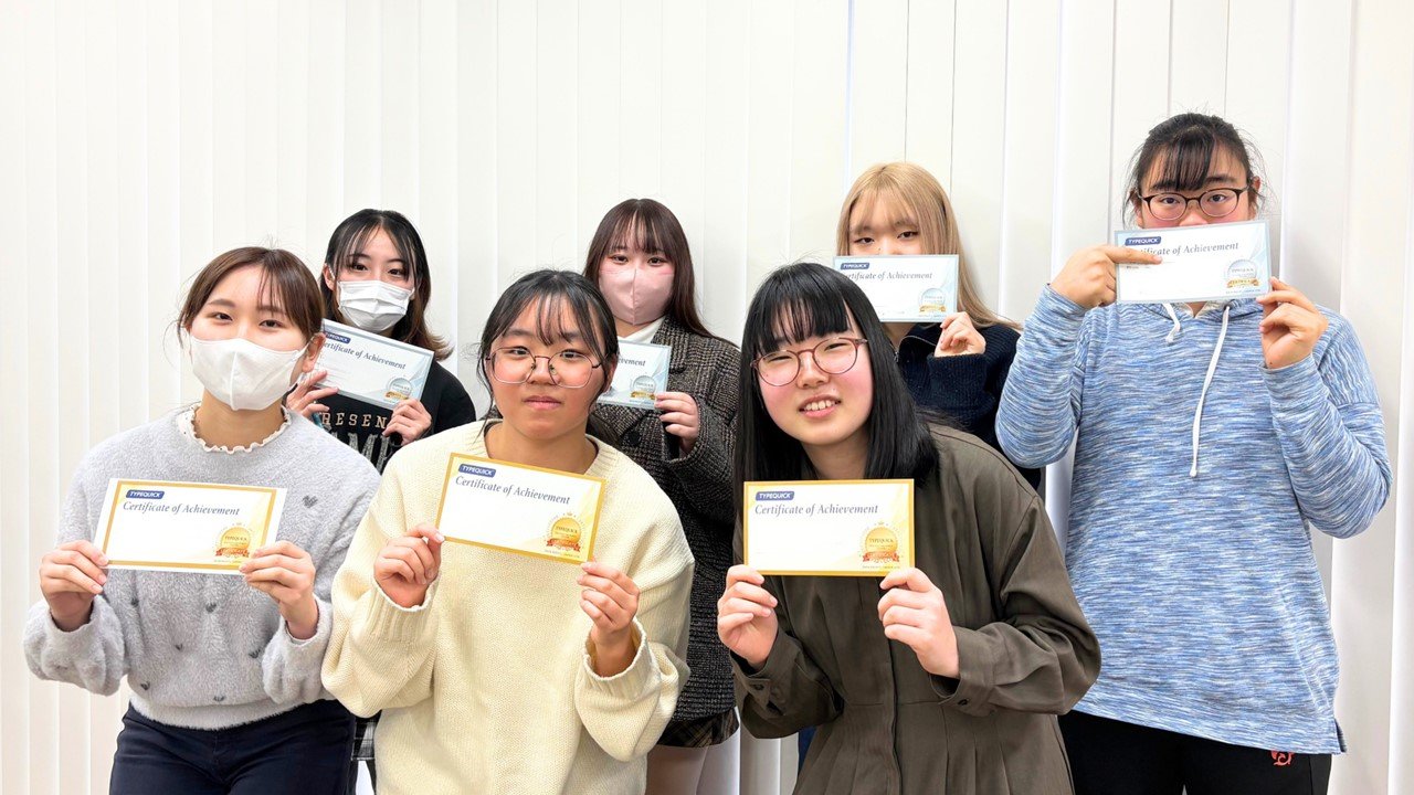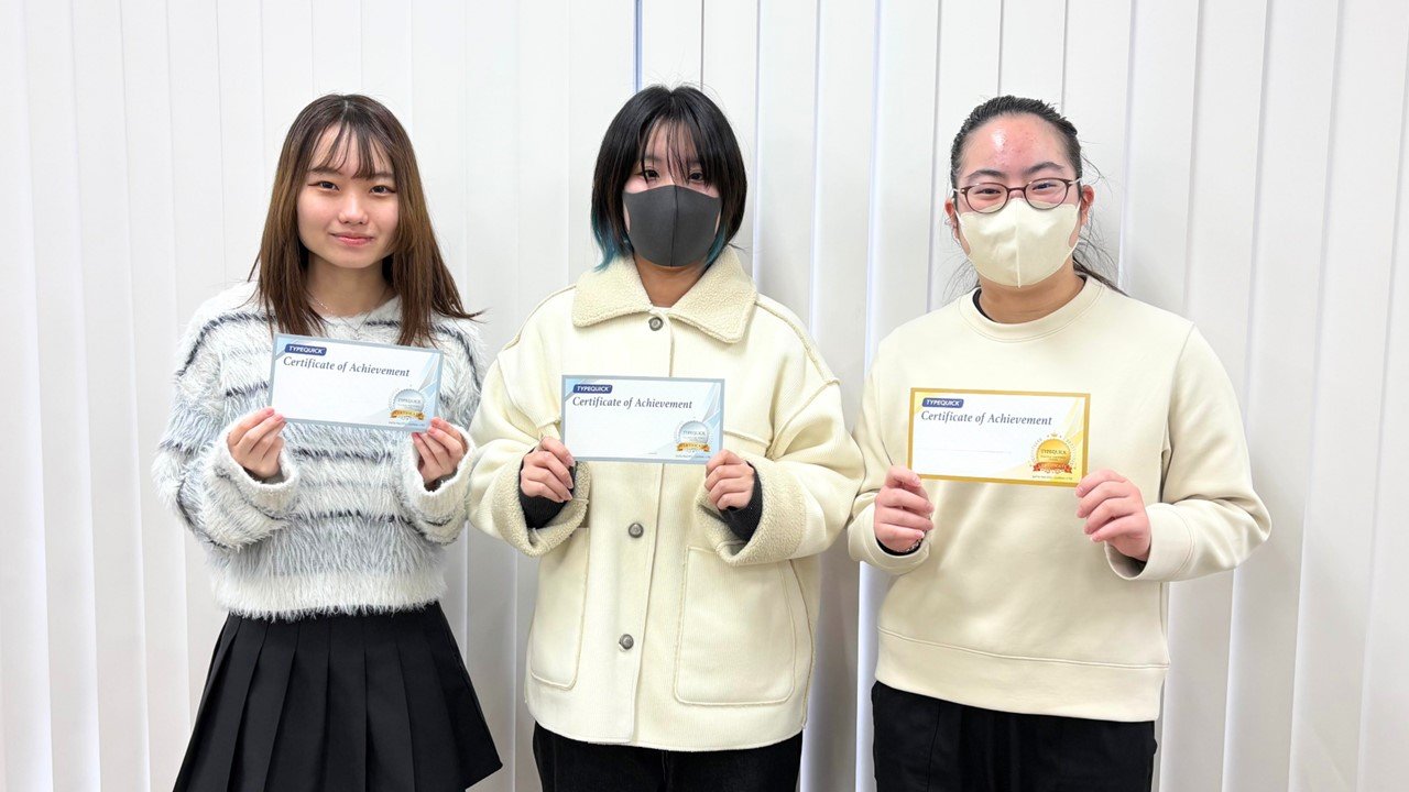PC初学者を対象とした「ICTベーシックA・B」の履修者および TypeQuick 希望者など200名を超える学生が5月から練習に取り組み、このたび同社より認定証が授与されました。プロレベルの上級スキルを示す《GOLDレベル》に12名、コンピュータユーザとして十分なタイピングスキルを示す《SILVERレベル》に40名が認定されました。