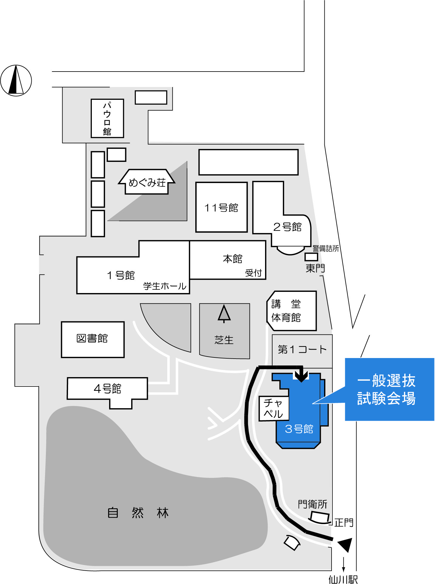試験は3号館で行います。正門より入構し、案内に沿ってお進みください。