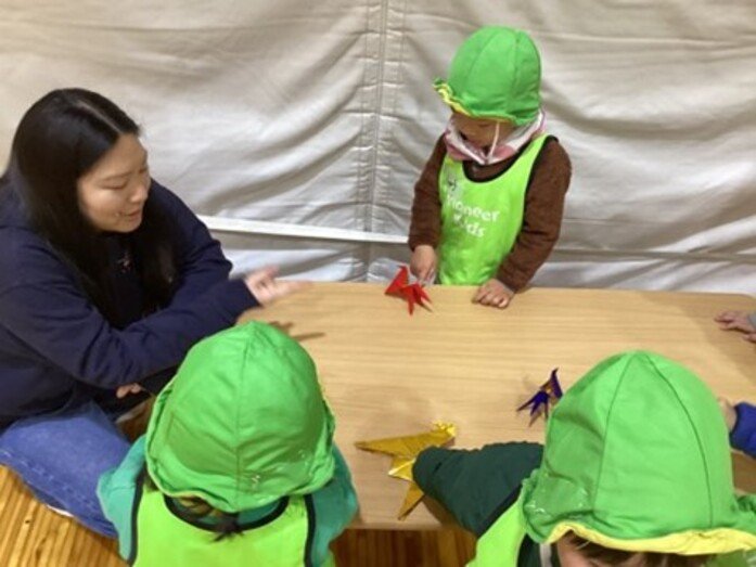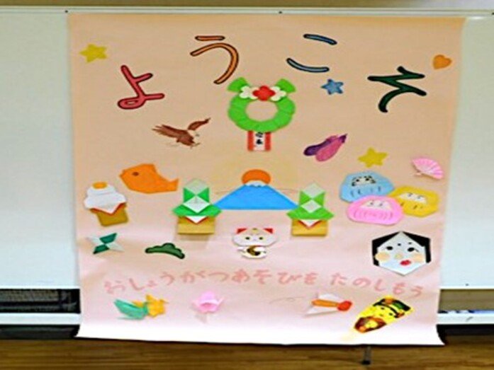 今回の「お正月あそび」は、羽根つき、こま回し、けん玉、めんこ、たこあげ(ビニール凧)、紙ふうせん……、そして今年は折り紙コーナーも登場。折り紙でコマや宙返り馬を折ったり、ビー玉で折り紙のだるまを倒したり、好きな遊びをたっぷり楽しんだ子どもたちでした。コーナーでは学生たちがリーダーとなり、一緒に正月あそびを楽しみました。外の芝生では、作ったビニール凧を持って、全速力で走っていた子どもたちの姿がありました。