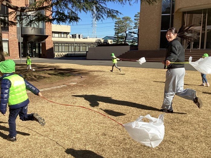 新年が明けたばかりの1月8日(木)、キャンパスにほど近い認可保育園として日頃から交流を持つ「パイオニアキッズ仙川園」「パイオニアキッズ第2仙川園」とのコラボ企画を行いました。冬晴れのポカポカ陽気の中、3・4・5歳児の大勢の子どもたちと、初等教育学科の石沢順子教授・椎橋げんき准教授・土橋久美子准教授のゼミ学生19名とで「お正月あそび」を楽しみました。