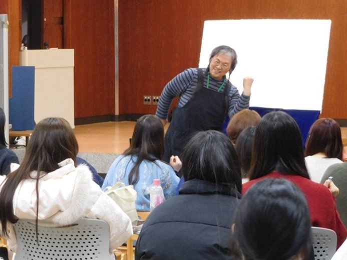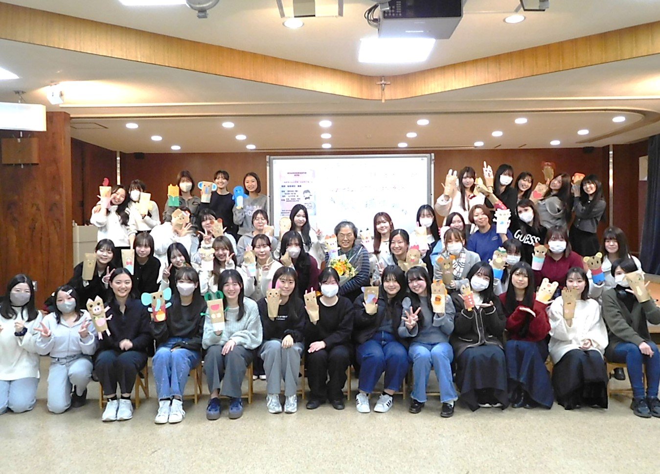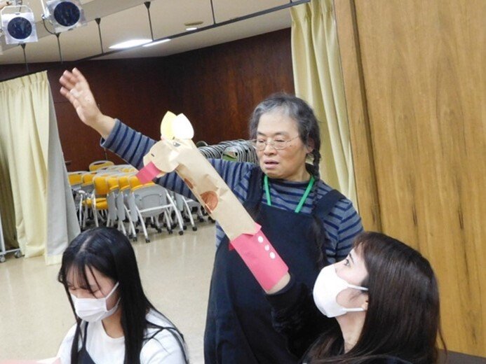 人間総合学部初等教育学科では、学生が主体となって活動をしている初等教育学会があり、学会活動の中で、毎年講師を招いて講演会を開いています。今年度最後の講演会は、1月16日(金)に和氣瑞江先生を迎えて、実際の保育現場で親しまれている「わけちゃんシアター」を開催しました。和氣先生(わけちゃん)は、複数の大学で講師を務め、子どもたちを対象に幼稚園や保育園でパネルシアターや人形劇などの公演で活躍しています。