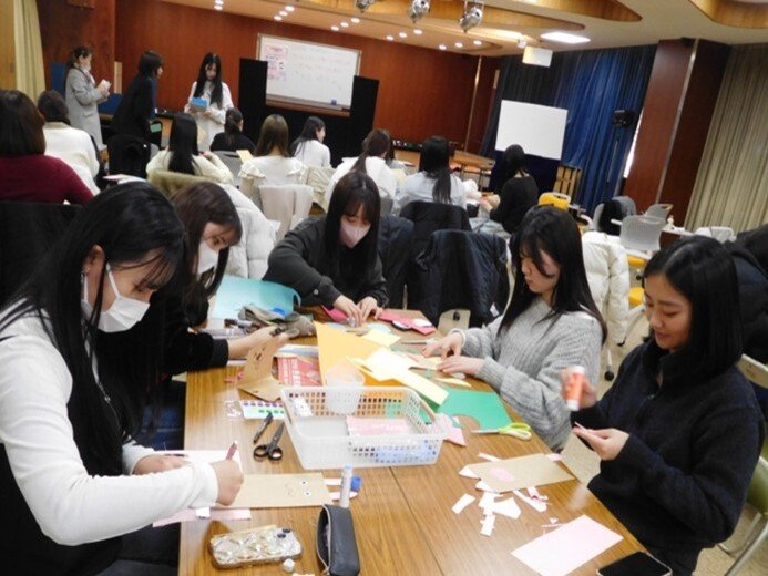 今回の講演会では、保育現場で親しまれているパネルシアター、ペープサート、人形劇などを鑑賞し、後半は参加者も一緒に封筒を使っての人形作りを行いました。好きな動物など思い思いのイメージを形に変えようと、夢中になって制作している姿がありました。様々な児童文化財に触れ、新たな気づきや発見もあったことでしょう。これからの実習などで活用していくことを期待しています。
